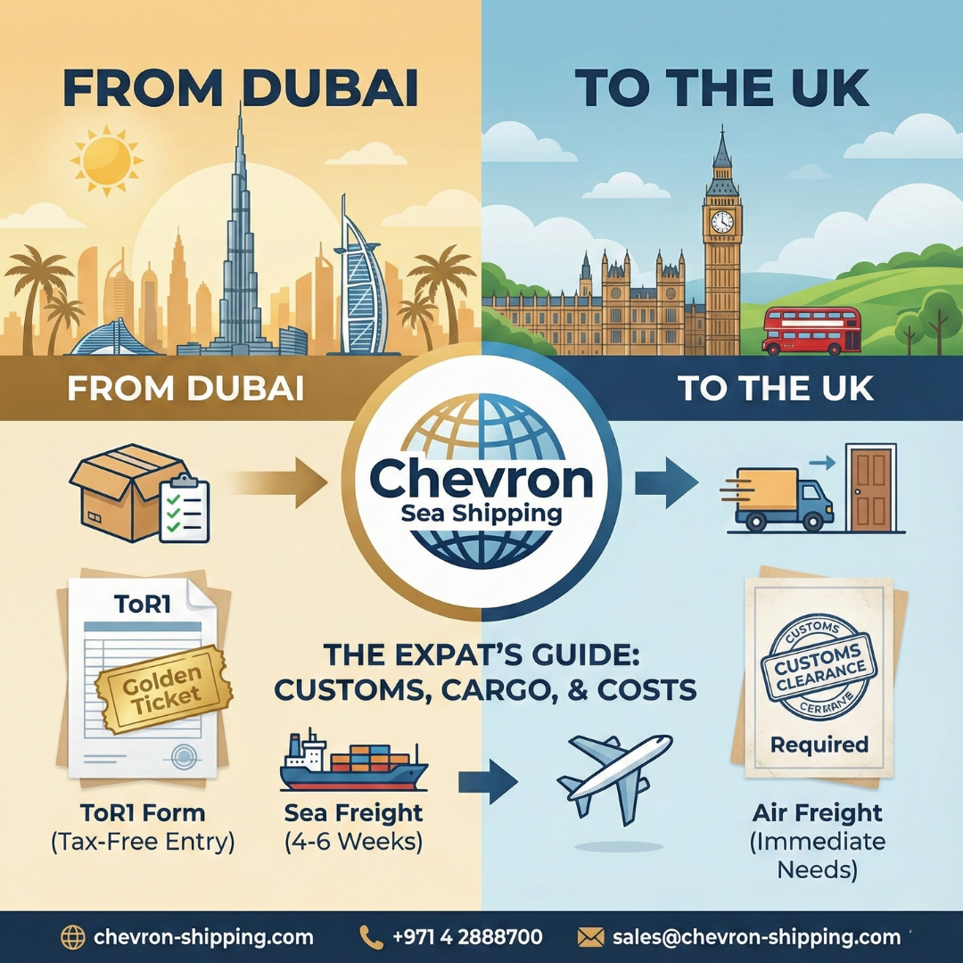 You handle the goodbyes in Dubai; let us handle the logistics. With years of experience on the UAE-UK route, Chevron Sea Shipping ensures your belongings arrive safe, dry, and on time.